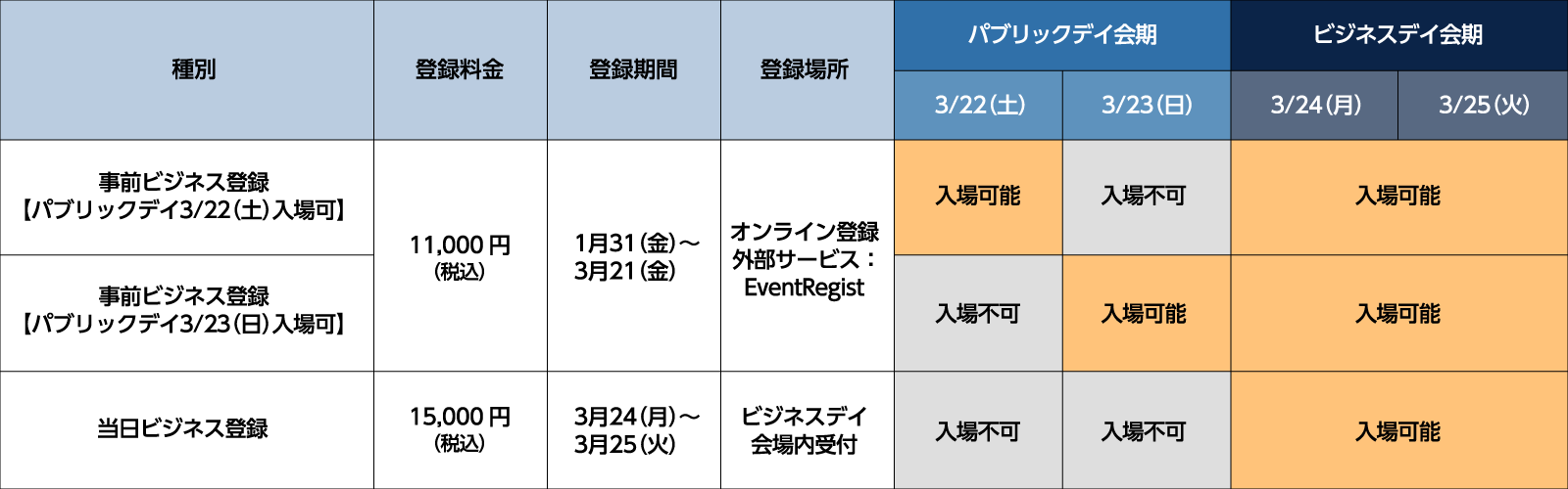 | 当日登録期間 | 2025年3月24日(月)10:00~17:30 2025年3月25日(火)10:00~16:30