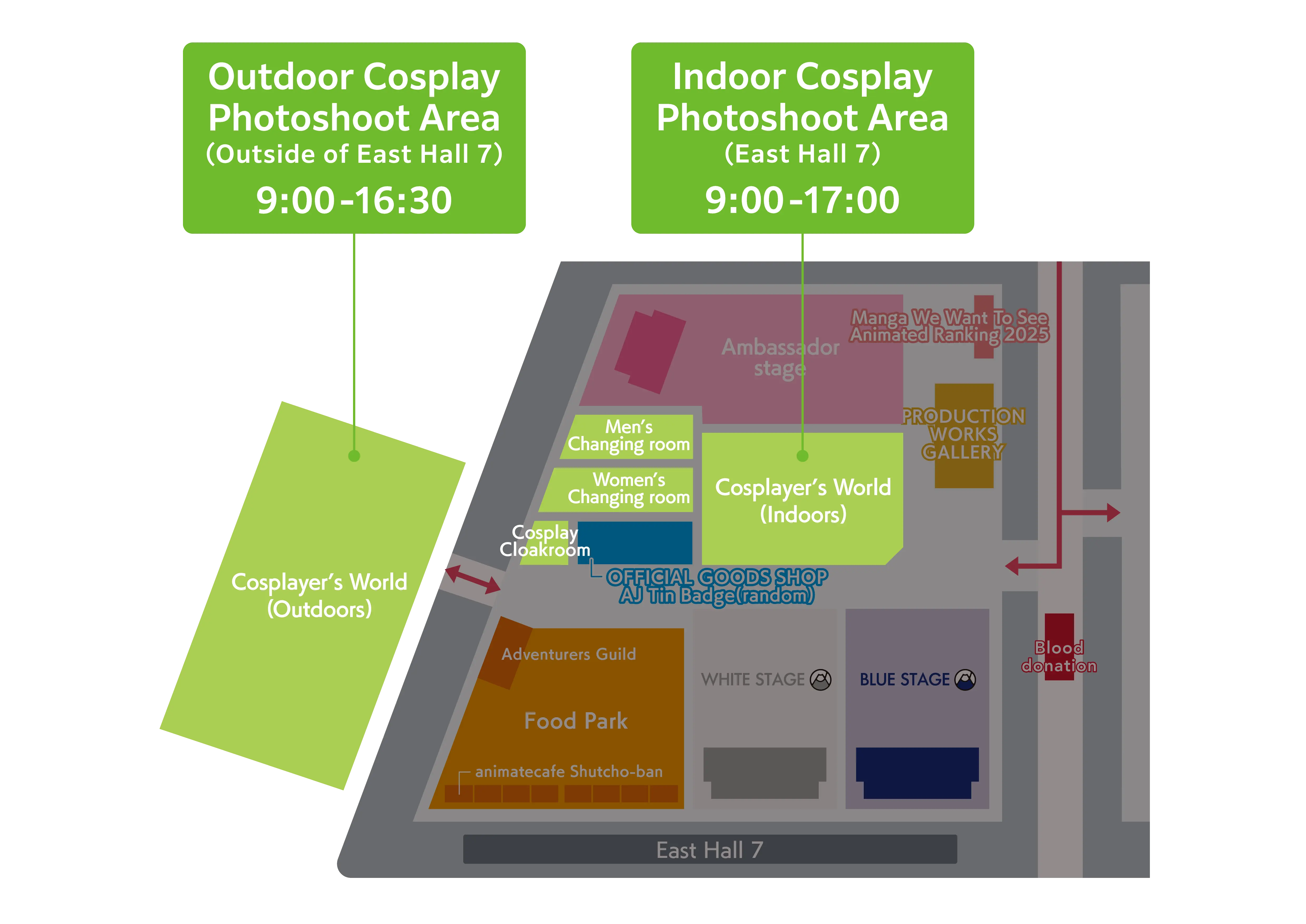 - ・After using the early morning cosplay changing room and cloakroom, cosplayers shall enter the venue from the general entrance.