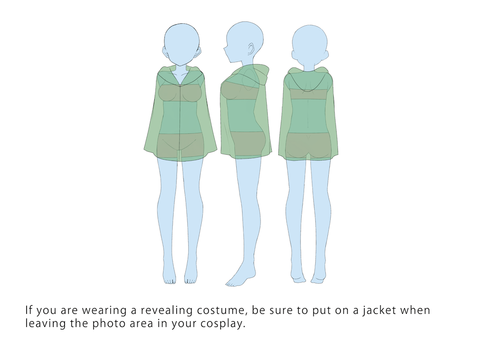 *Although there are no restrictions on the upper body for male cosplayers, cover your body with a jacket to limit exposure when you are not taking photos. - ・When the staff deems your costume problematic, you may be asked to change the costume or to wear a jacket regardless of the above rules. Your cooperation is appreciated.