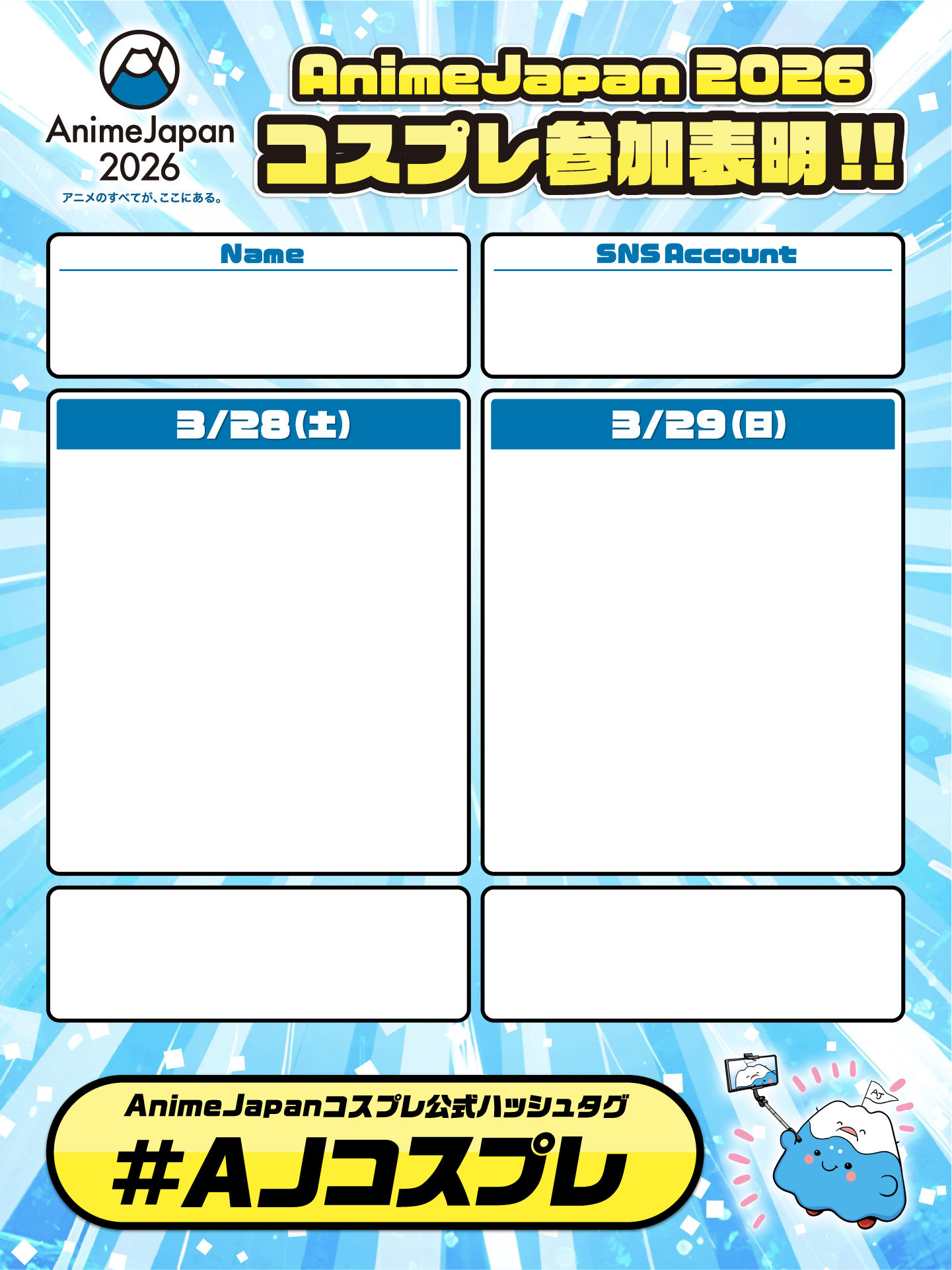 コスプレ登録はacosta!にて前売りチケットをご購入のうえ、AnimeJapan 2026当日、コスプレエリア内(南3ホール)の受付までお越しください。
