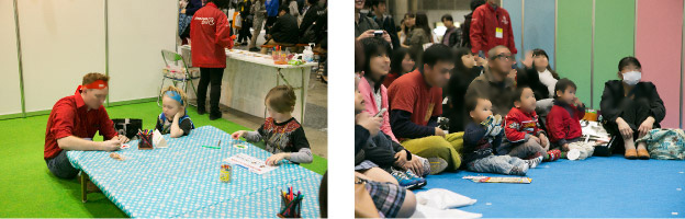 ワークショップでは、アニメの手作り体験を実施した。参加者にはキャラクターの絵が両面に描かれ、左右にゴムバンドがついたコースターを配布。ゴムのねじれを利用して回転させることでキャラクターが動いているように見え、アニメの仕組みがわかるという企画である。思い思いに着色して遊んでいる子どもたちが多く、アニメを「より身近なもの」として感じてもらう絶好の企画となった。